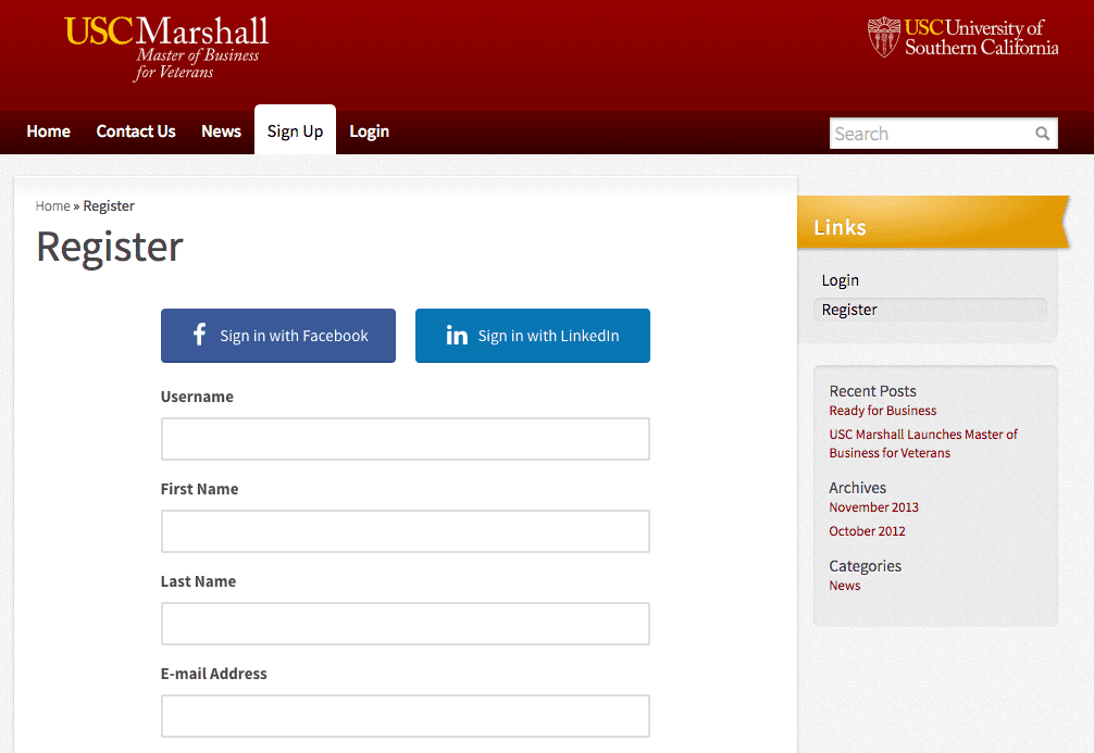 You can choose to create an account using Facebook or LinkedIn. If you elect to use this option, your email address and image will automatically be added to your new profile and you will not need to create or manage a new account password. The social login is a two-step process that will take you back to the registration system after you have signed in and you will complete entering all the information needed for your application.