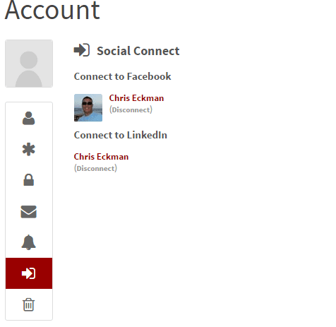 Then, click on either or both buttons to tie your social account to your current account. To later disconnect your social account you can click on the link to disconnect your account.