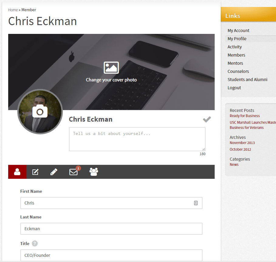 To edit your profile, click on the link for “My Profile” and click on the cardinal colored “gear” icon. A dropdown will appear, click on the link for “Edit Profile”.