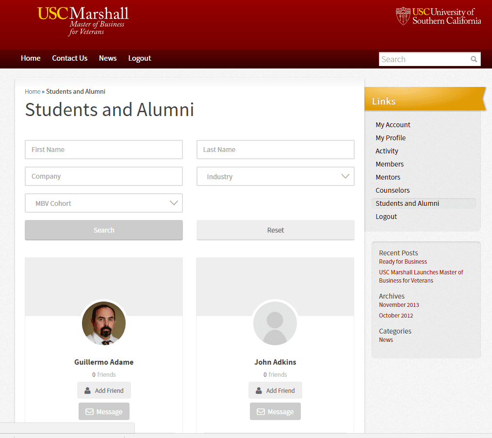 For a directory listing of all students, alumni, mentors, and counselors you can click on the link for “Members”. You can search and filter the directory using first name, last name, company, industry, or MBV Cohort. There are 3 other directories with listings for mentors, counselors, and students & alumni. All directories are not publicly accessible you must be a member of the website to access these areas.